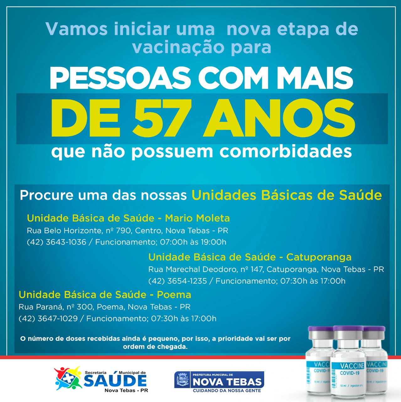 Iniciamos o dia com mais um avanço na vacinação contra a COVID. Se você tem 57 anos ou mais procure uma das nossas Unidades Básicas de Saúde (UBS) e proteja-se.