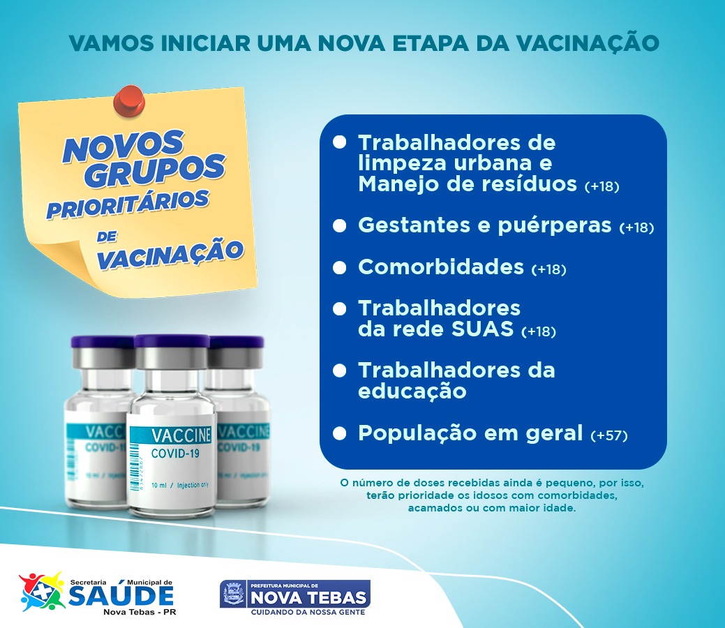 Além da vacinação da população em geral com 57 anos ou mais. A Secretaria de Saúde dá início a vacinação de Trabalhadores da Limpeza Urbana e de Manejo de Resíduos, assim como continua a vacinação dos grupos prioritários entre esses o de Gestantes e Puérperas com mais de 18 anos.
