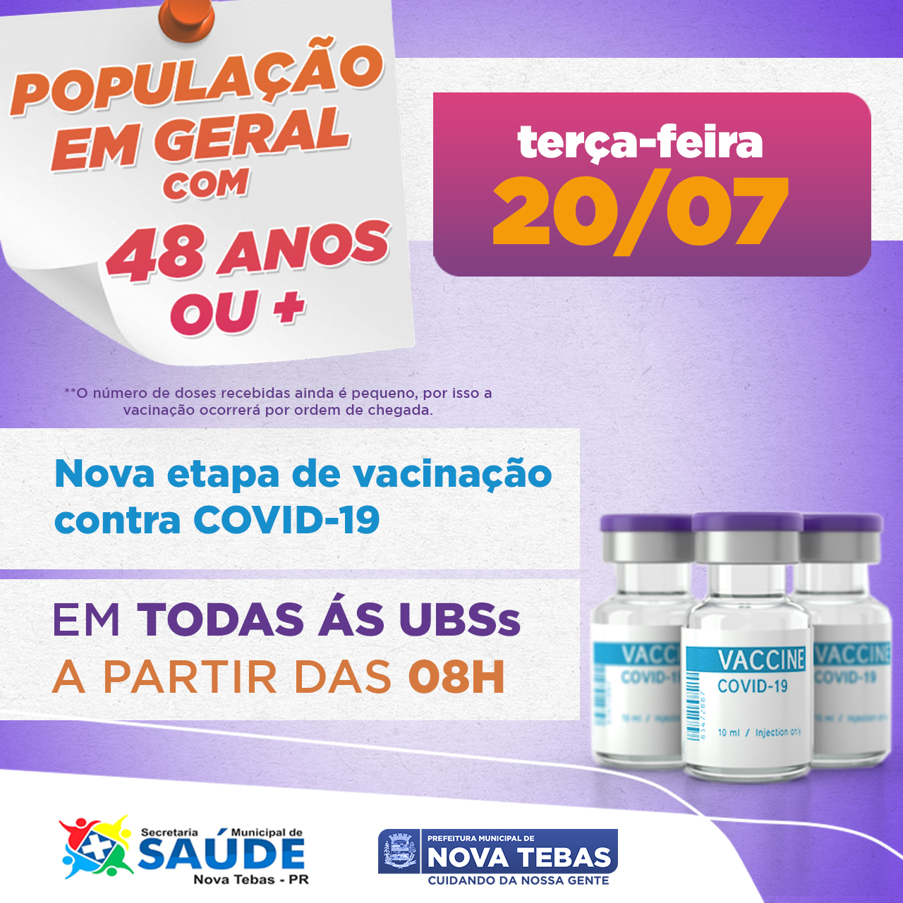 Lembramos que as doses ainda são poucas, por isso a vacinação vai acontecer por ordem de chegada.