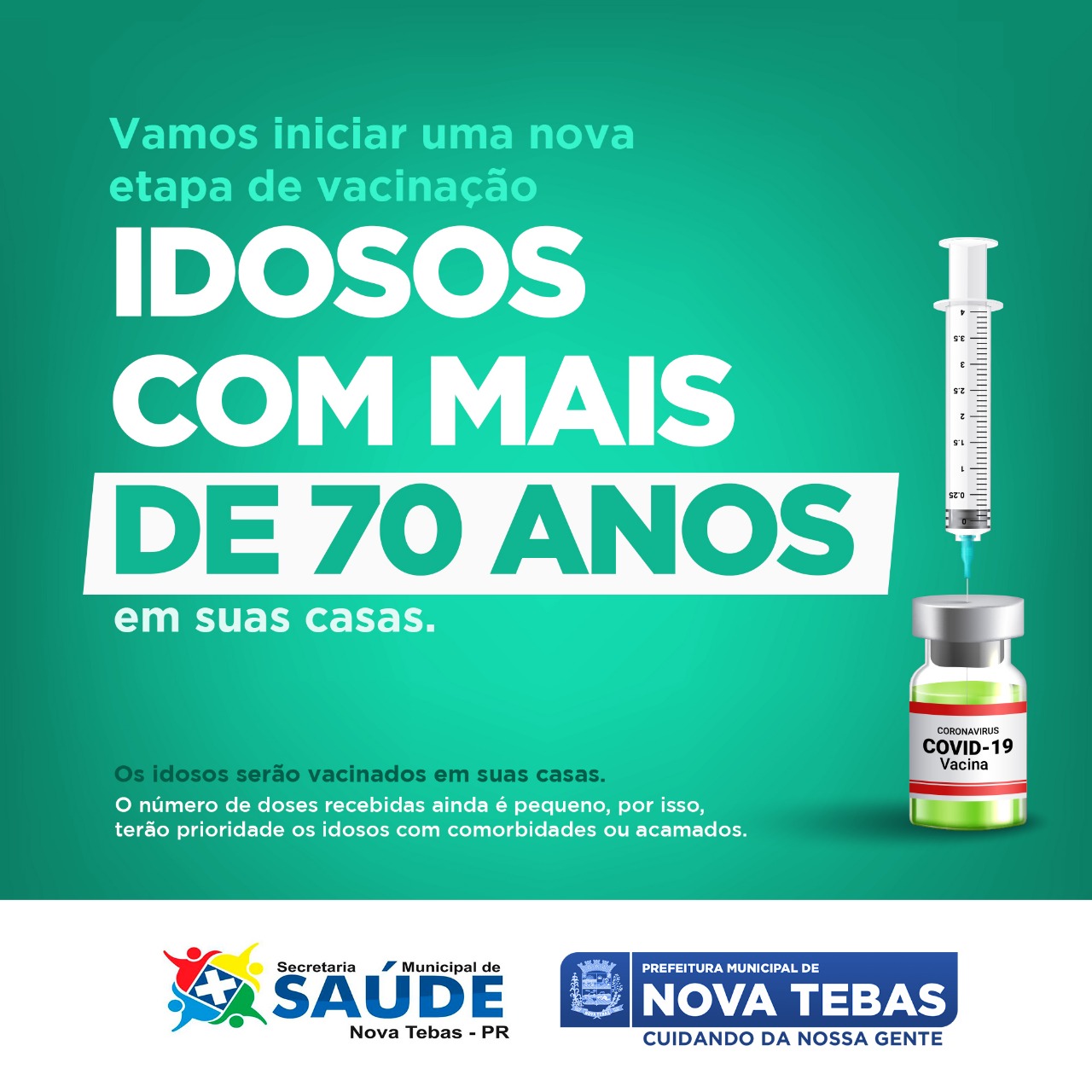 A partir de hoje (25) a secretaria de saúde vai iniciar a vacinação de idosos com mais de 70 anos. Lembramos que os idosos não precisam se deslocar para receber a vacina, pois a equipe de saúde vai fazer a imunização nas casas.