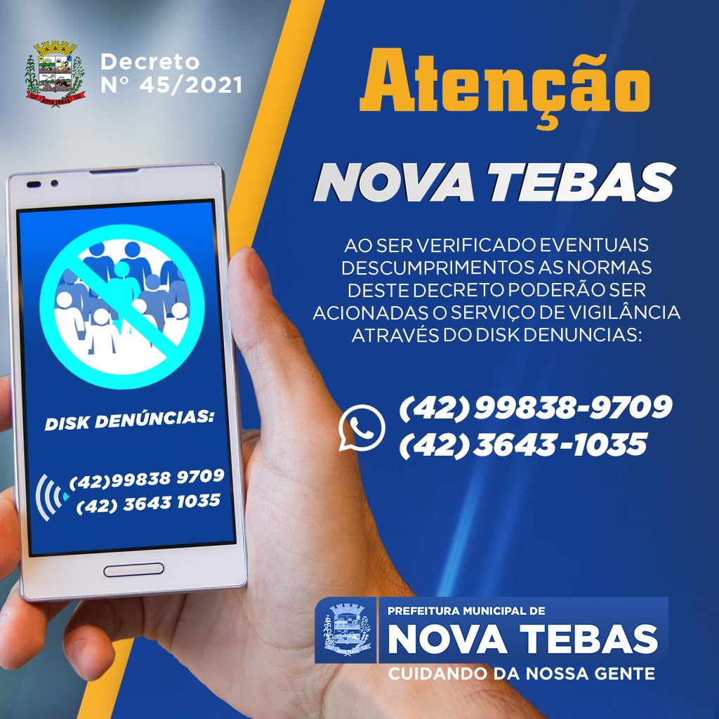Em caso de descumprimento das regras impostas no decreto 045/2021 as denuncias podem ser feitas nos seguintes telefones : 42 3643 1035 / 42 99838 9709