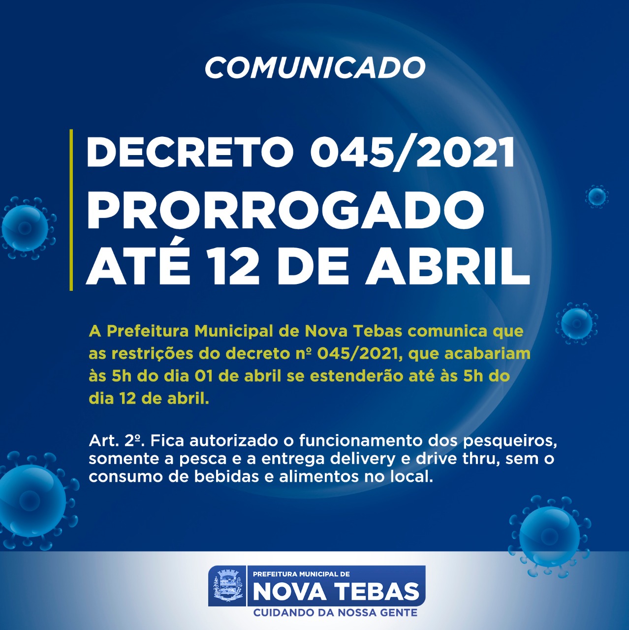 A Prefeitura de Nova Tebas decide por prorrogar o decreto 045/2021 . As restrições que acabariam no dia 01 de abril se estenderão até às 5h do dia 12 de abril.
