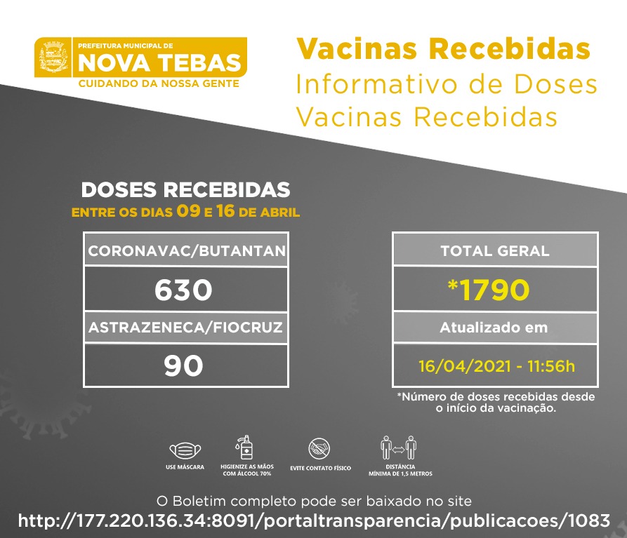 Entre os dias 9 e 16 de abril a Secretaria Municipal de Saúde recebeu 630 doses da vacina coronavac/butantan e 90 doses da vacina astrazeneca/fiocruz. No total, desde o inicio da vacinação Nova Tebas já recebeu 1790 doses de vacinas.