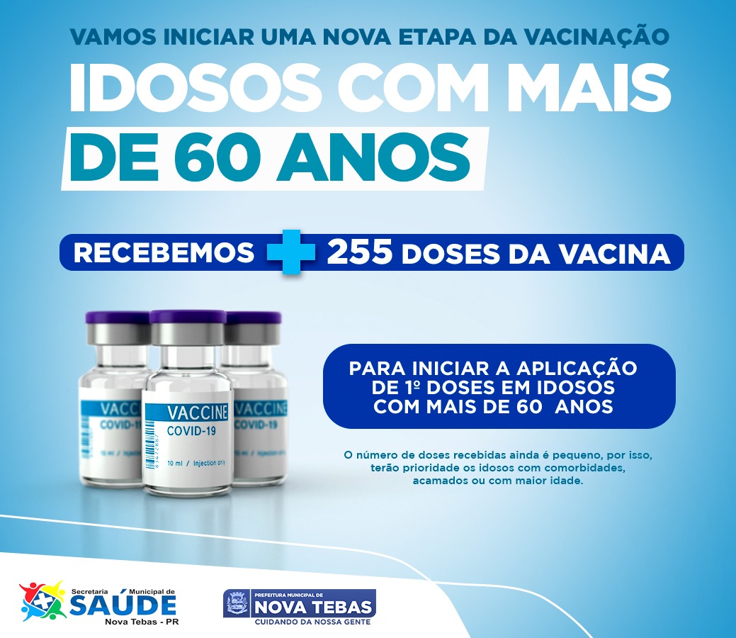 Recebemos mais um lote de vacinas, com isso partir de amanha (04) a equipe de profissionais da saúde do município estará imunizando, com a primeira dose, os idosos com 60 anos ou mais.