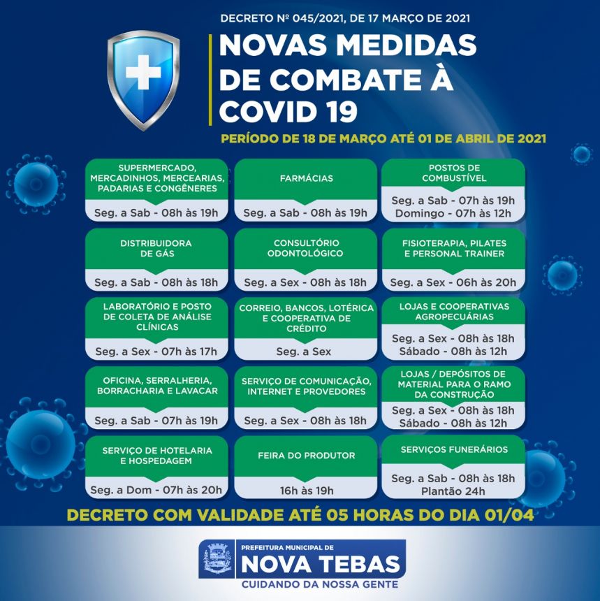 Conheça algumas das ações, restrições e regras impostas pelo decreto 045/2021 de 17 de março de 2021 com vigência até 01 de abril de 2021.